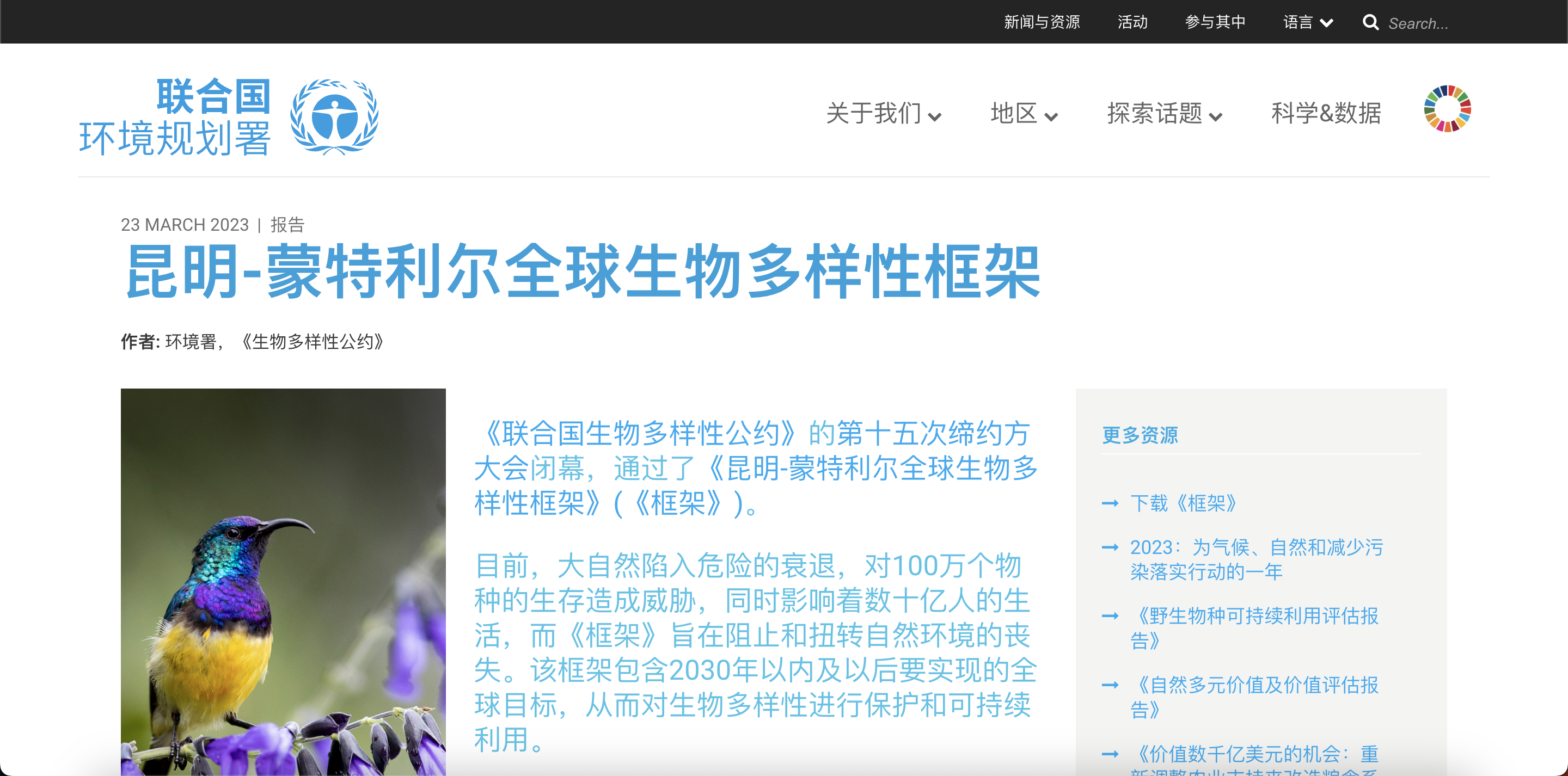 聯合國環境署中文版《昆明—蒙特利爾全球生物多樣性框架》完整內容與目標說明。